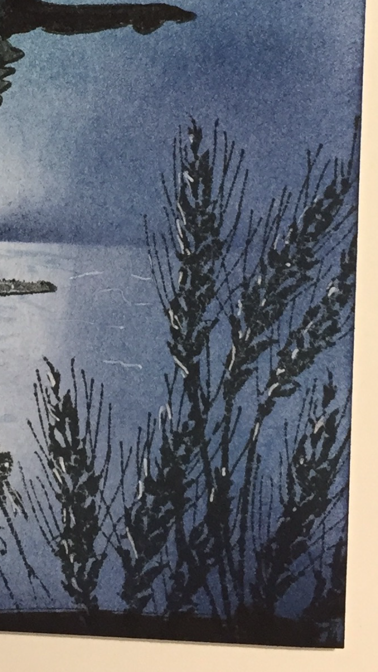 I filled in the stamped focal image of the girl using black SU marker and used grey marker on the skirt of the image to make it appear lighter, like moon shining through the fabric. White gel pen was used on the water and the botanicals in the forefront to create a sense of depth and light. Finally I added wink of stella to the moon and water, giving the subject the needed shimmer effect.